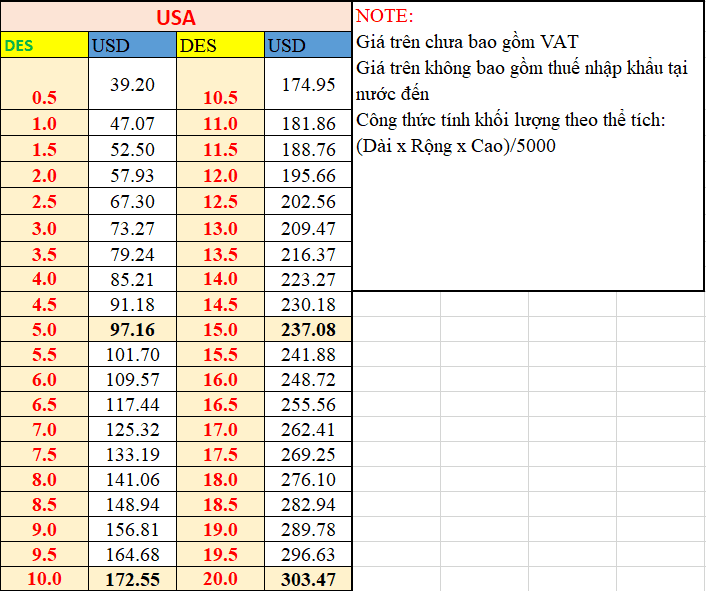 Tham khảo bảng giá cước dịch vụ gửi hàng đi Mỹ tại Hà Nội của Việt An Express